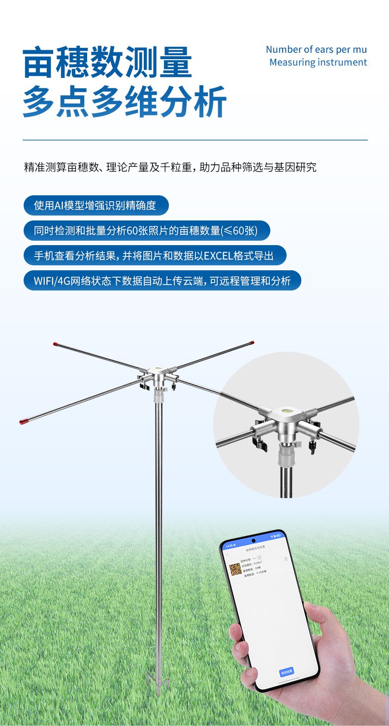 本設(shè)備適用于田間調(diào)查、育種選育、產(chǎn)量預估等多種應用場景,為小麥的品種篩選、小麥產(chǎn)量預測、產(chǎn)量基因定位和功能解析發(fā)揮著至關(guān)重要的作用。可顯著減少人工計數(shù)帶來的誤差與勞動強度。用戶只需在田間選定樣方區(qū)域,拍攝圖像后即可自動獲得畝穗數(shù)估算結(jié)果,是農(nóng)業(yè)數(shù)字化與智能化發(fā)展的有力工具。