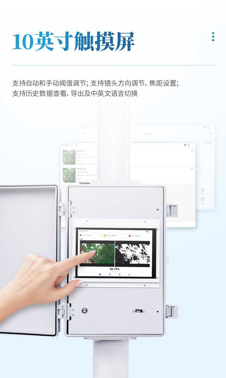 4. 分析主機:10寸彩色觸摸顯示屏,支持自動和手動閾值調節;自動區分植被與非植被區域;支持鏡頭方向調節、焦距設置;支持歷史數據查看、導出及中英文語言切換。