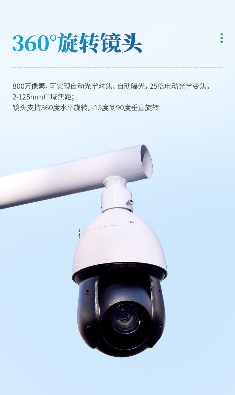 3. 攝像設備:800萬像素,可實現自動光學對焦、自動曝光,25倍電動光學變焦, 2mm-125mm廣域焦距;鏡頭支持360度水平旋轉,-15度到90度垂直旋轉