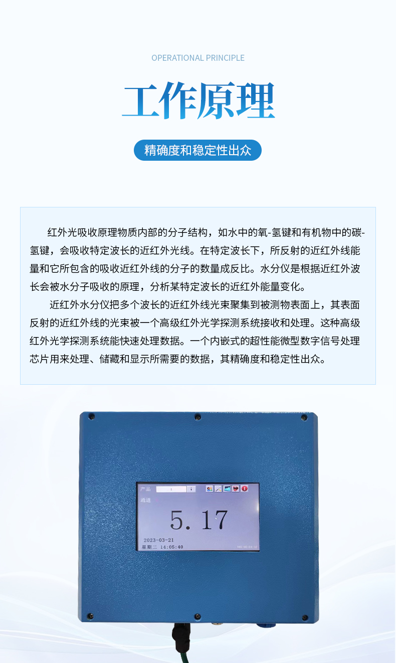 近紅外水分儀把多個波長的近紅外線光束聚集到被測物表面上,其表面反射的近紅外線的光束被一個高級紅外光學探測系統接收和處理。這種高級紅外光學探測系統能快速處理數據。一個內嵌式的超性能微型數字信號處理芯片用來處理、儲藏和顯示所需要的數據,其精確度和穩定性出眾。