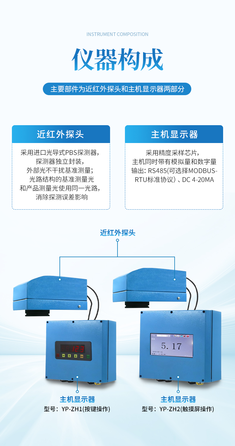 近紅外探頭:采用進口光導式PBS探測器,探測器獨立封裝,外部光不干擾基準測量;光路結構的基準測量光和產品測量光使用同一光路,消除探測誤差影響。